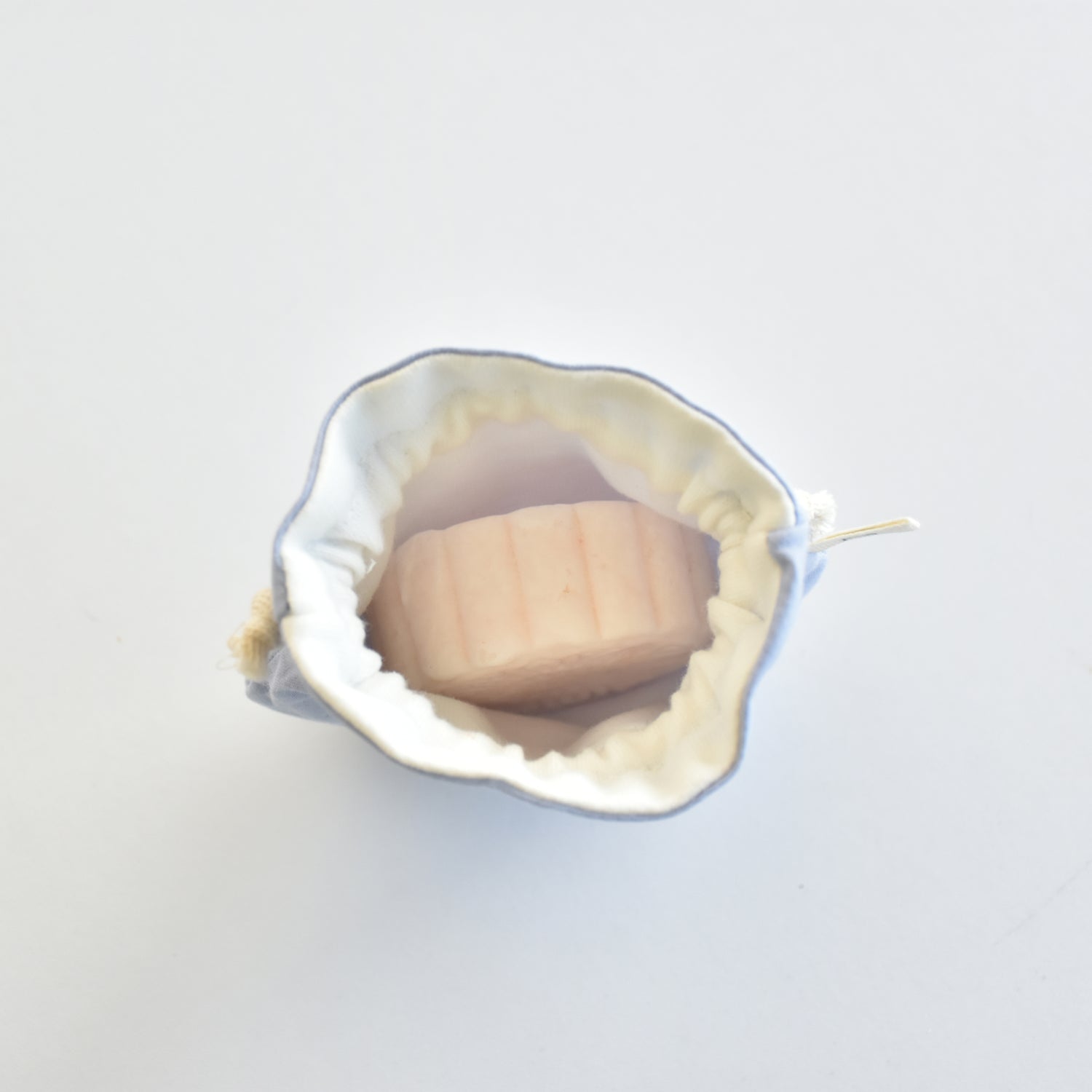 - Coloca tu champú sólido dentro de la funda de tela y cierra la funda halando de los cordones laterales para asegurar el champú en su lugar.